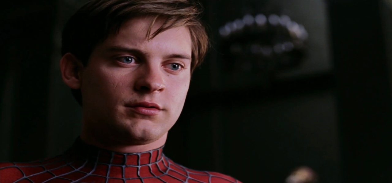 In Tobey Maguire, Peter Parker è un giovane studente del Queens, New York, e vive insieme allo zio Ben e alla zia Mary dopo essere rimasto orfano da bambino. Per guadagnarsi qualche soldo lavora come fotografo per il Daily Bugle, un quotidiano locale diretto dal burbero J.J. Jameson. Nutre un forte sentimento per Mary Jane Watson, sua compagna di università, ma non trova mai il coraggio di rivelare il suo amore. Un giorno, durante una visita al Columbia Genetics Research Institute, Peter assiste ad alcuni esperimenti scientifici su dei ragni e uno di questi lo morde.