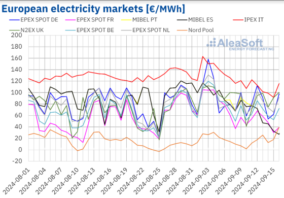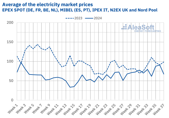 Il primo grafico mostra un confronto tra i prezzi dell’energia elettrica in alcuni Paesi europei dall’inizio dell’anno sino a metà settembre: la linea continua indica il valore medio del 2024, la linea tratteggiata quello del 2023. Il picco di inizio 2023 mostra la coda della drammatica emergenza che aveva avuto inizio nella primavera dell’anno precedente. Anche nei mesi successivi (quando gli effetti della crisi si erano attenuati) risulta evidente il divario dei prezzi tra i due anni che mostra il forte calo verificatosi ad esempio in Francia, Spagna, Germania e Uk.