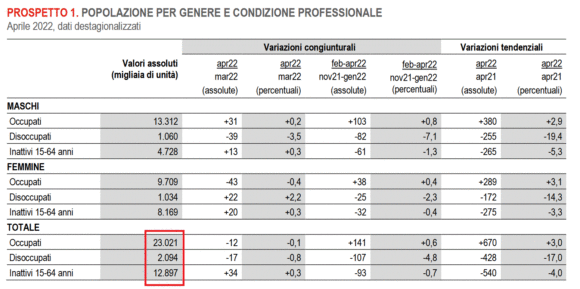 La popolazione italiana è di poco inferiore ai 59 milioni di persone (58.983.122 al primo gennaio 2022). Da questo intero ammontare, escludendo sia i 7.476.667 minori di età (rif. inferiore ai 15 anni) che i 16.041.202 percettori di pensione (dati Inps al 31.12.2020), la restante platea potrà essere suddivisa in: occupati, disoccupati e inattivi. Per quest’ultimo insieme, le risultanze di Istat con riferimento ad aprile sono chiare: 23 milioni sono gli occupati, 2 milioni i disoccupati e quasi 13 milioni gli inattivi (15-64 anni).