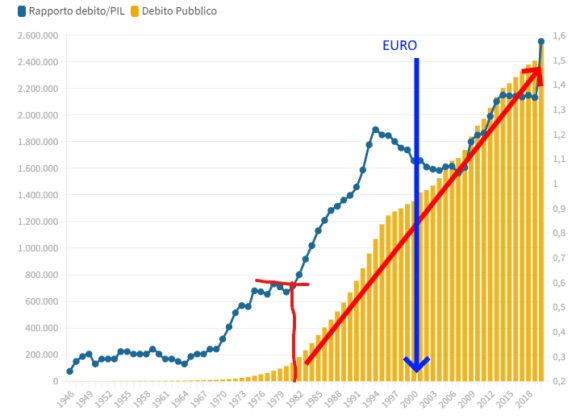 Si vede chiaramente il debito esplodere dopo il 1981, cioè dopo il divorzio tra ministero del Tesoro e Banca d’Italia, cioè quell’atto col quale Bankitalia smetteva di acquistare i titoli di Stato, di fatto mettendo il prezzo di questi titoli nelle mani della speculazione internazionale. Quello fu l’atto preliminare a tutta la costruzione della moneta unica, per cui tutti i passaggi successivi sono soltanto passi in avanti dello stesso piano.