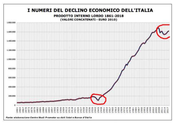 Ebbene, il quadro generale, di cui occorre necessariamente tenere presente quando si parla di economia, è evidenziato, per esempio, dal seguente grafico del Pil italiano dall’Unità dell’Italia (1861) a oggi.