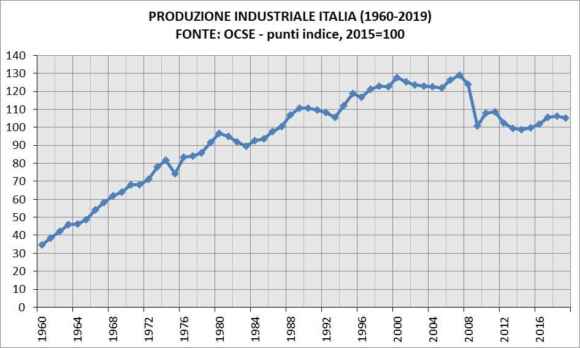 Di fatto, dall’introduzione dell’euro nel 2001, non è più cresciuta, fino al brusco calo dalla crisi del 2008. Il grafico precedente dice solo questo: se si passa da 100 a 55, si ha un calo del 45%. Se poi da 55 si aumenta del 75% si arriva a 96,25, cioè un livello inferiore a quello di partenza. Questo vuol dire che il trend negativo sta continuando e le politiche scellerate dei Governi Conte (1 e 2) e accentuate dal Governo Draghi stanno continuando, sotto la “sapiente” direzione del ministro dell’Economia Giorgetti, che non è un luminare dell’economia, ma ha il “pregio” di essere un amico e seguace di Draghi.