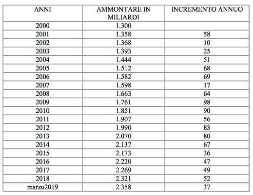 Esaminando i dati, si rileva che il debito pubblico italiano riveniente dalla conversione del debito pubblico preesistente all’euro e non influenzato dalle normative europee era pari, a fine 2002, anno di introduzione della moneta a debito, a 1.368 miliardi di euro (l’Italia aveva accumulato tale debito in ben 132 anni, venendo fuori da guerre e da bombardamenti che ne avevano più volte fiaccato l’economia). Nei soli 16 anni successivi il debito ha toccato la cifra di 2.321 miliardi, con un incremento del 69,7% (in valore assoluto 953 miliardi), quasi 60 miliardi all’anno, rispetto ai 10 annui di vigenza della sovranità monetaria in capo allo Stato.