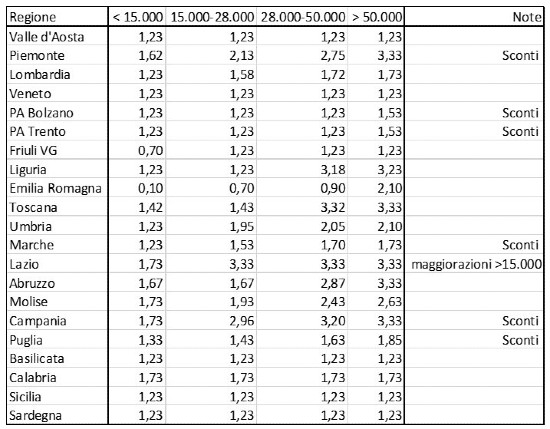 Vale allora la pena di fare il punto sulla questione, grazie anche alle informazioni presenti in internet nei siti istituzionali: la tabella che segue riporta i valori percentuali della addizionale IRPEF che nel 2025 saranno applicati dalle regioni in funzione delle fasce di reddito (con l’avvertenza che i valori riportati in tabella vanno sempre presi con un certo beneficio di inventario perché in più di un caso ci si è trovati di fronte a valori diversi a seconda delle fonti, sempre istituzionali, disponibili).