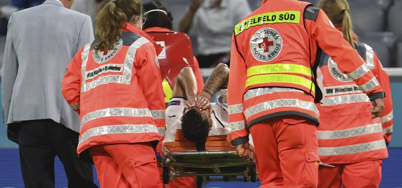 Spinazzola esce dal campo in barella durante Belgio Italia (LaPresse)