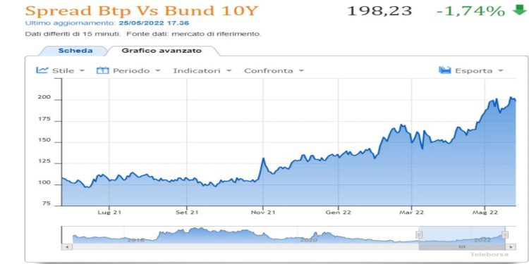 Lo spread BTP Bund oggi si ferma a 198,23 punti base con un ribasso del 1,74%.
