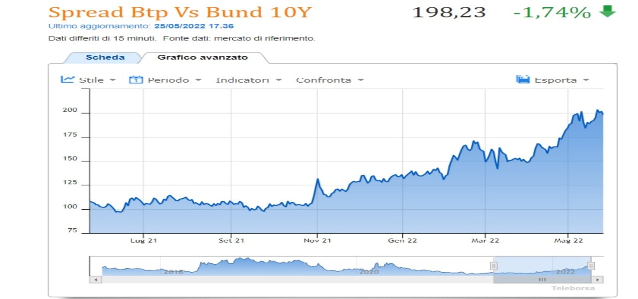 Il minimo annuale resta comunque a 128,6, mentre il massimo di 208,59 è stato toccato proprio ieri 24 maggio, giornata nera per il differenziale che ha così superato il massimo di 208,49 segnato il 9 maggio scorso.