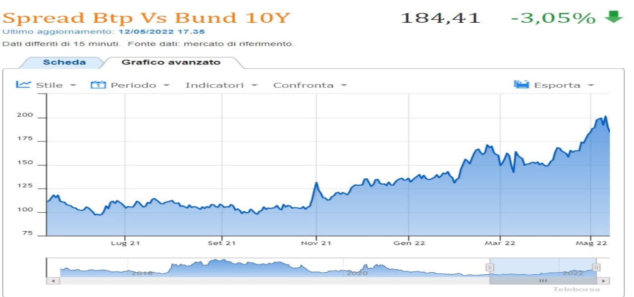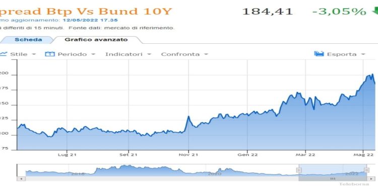 Lo Spread Btp Bund recupera decisamente terreno. Il differenziale tra i btp italiani contro i bund tedeschi a 10 anni oggi ha chiuso a quota 184,41 recuperando il 3,05% dopo il recupero del oltre 7% di ieri 11 maggio 2022.