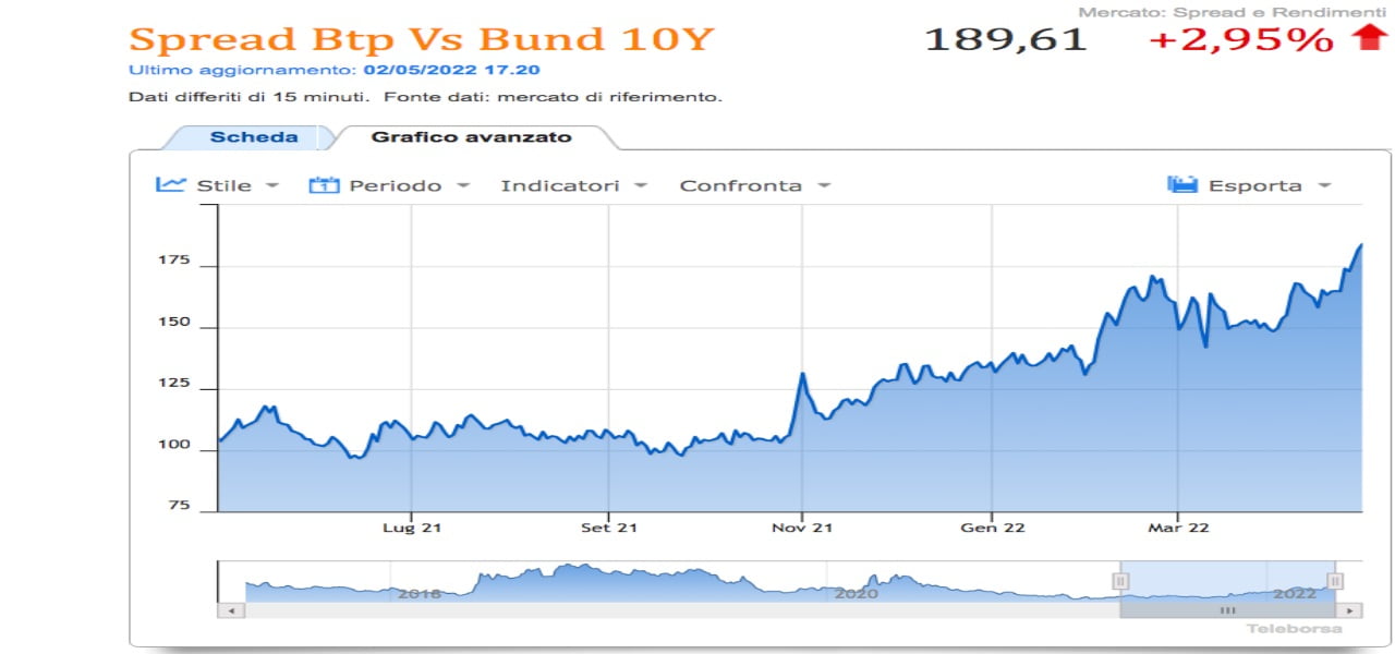 La settimana precedente aveva creato già allarme, non soltanto in Italia, ma anche in Germania. Nella giornata di ieri 01 maggio 2022, lo spread aveva raggiunto un massimo di 184. Molto più della forbice sopra i 170 punti della settimana scorsa. Tuttavia la chiusura della giornata ha visto un aumento del differenziale del BTP italiano e BUND tedesco, che ha poi chiuso a 188,27 punti base.