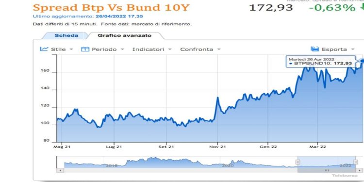 Spread Btp Bund, oggi 26 aprile 2022 a 172,93 punti base: migliora rispetto a ieri dove ha chiuso a 174 punti, ma si allarga la forbice delle oscillazioni sopra i 170 punti.