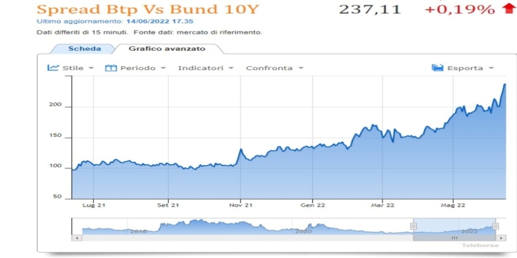 Se la giornata di ieri si è chiusa a 236,11 oggi il differenziale ha aperto in rialzo a 236,67 e ha proseguito disegnando nuovi massimi a 243,58 punti. E non è un bel segnale. Già ieri Christine Lagarde si stava domandando in che modo frenare quest’ascesa e cercare di evitare il tracollo delle borse, l’opzione è stata quella di alzare i tassi ma i falchi l’hanno contraddetta: in poche ore la comunicazione proveniente dalla BCE è cambiata. Non più un aumento dei tassi di 0,50% ma un aumento di un quarto. Solo 0,25% entro settembre. L’aumento dei tassi oltretutto non piace a Mario Draghi o altri economisti di Francoforte, che propongono invece di prendere in mano la situazione del gas.