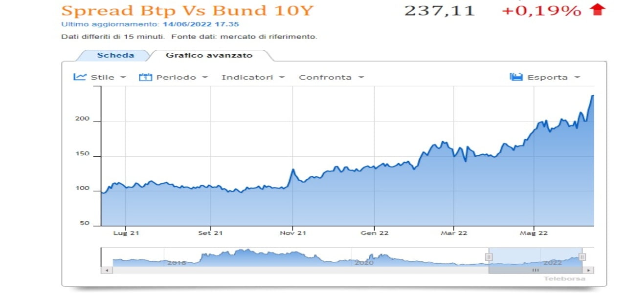 Se la giornata di ieri si è chiusa a 236,11 oggi il differenziale ha aperto in rialzo a 236,67 e ha proseguito disegnando nuovi massimi a 243,58 punti. E non è un bel segnale. Già ieri Christine Lagarde si stava domandando in che modo frenare quest’ascesa e cercare di evitare il tracollo delle borse, l’opzione è stata quella di alzare i tassi ma i falchi l’hanno contraddetta: in poche ore la comunicazione proveniente dalla BCE è cambiata. Non più un aumento dei tassi di 0,50% ma un aumento di un quarto. Solo 0,25% entro settembre. L’aumento dei tassi oltretutto non piace a Mario Draghi o altri economisti di Francoforte, che propongono invece di prendere in mano la situazione del gas.