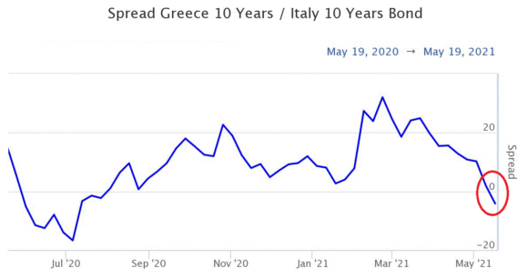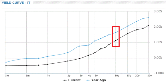 Nonostante il “sorpasso” ellenico e l’aumento della spesa per le casse del nostro Paese (in termini di interessi pagati al risparmiatore) giunge comunque una buona notizia. Analizzando la curva dei rendimenti decennali riconducibili ai titoli di Stato italiani, e soffermando l’attenzione agli ultimi dodici mesi, si può agevolmente apprendere come “lo stato di salute” del nostro Paese sia divenuto meno caro: da un rateo complessivo pari all’1,643% (maggio 2020) si capitola all’odierno 1,114%.