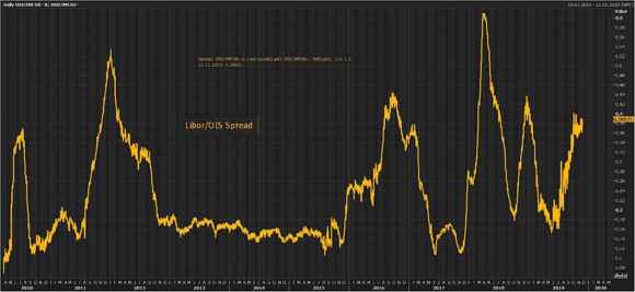 E sapete quando capiremo davvero quanto sia profonda la crisi strutturale creata proprio dal Qe sincronizzato e perenne? Ce lo mostra questo altro grafico, il quale evidenzia come lo spread Libor-Ois (di fatto, il proxy del costo del denaro a tre mesi nell’interbancario, il premio di rischio richiesto per ottenere denaro dalle controparti) si sia ampliato la scorsa settimana fino ai 39 punti base: qual è il problema?