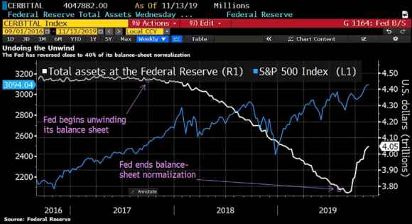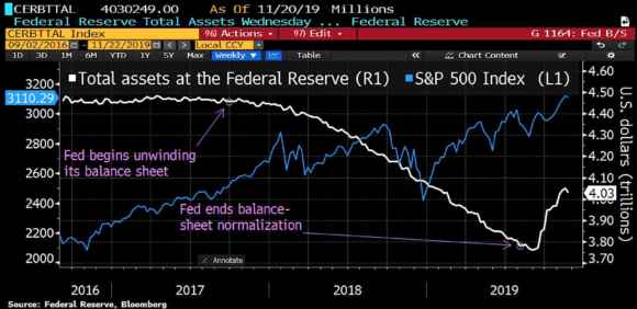Guardate questi due grafici: fanno riferimento alla medesima fonte, Bloomberg, alla medesima dinamica – la correlazione fra assets totali a bilancio della Fed e andamento dello Standard&Poor’s 500 – e sono stati pubblicati a una settimana esatta di distanza l’uno dall’altro, il venerdì a tarda sera, dopo la chiusura di Wall Street. Sarà certamente una coincidenza, ma la scorsa settimana, a fronte di un calo nel bilancio generale della Federal Reserve dovuto meramente a ragioni tecniche di fine anno che hanno portato le redemptions obbligatorie a superare gli acquisti, l’indice benchmark di Wall Street ha visto interrotto un rally che durava da sei settimane.