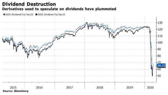 Ci mostra l’andamento degli ultimi anni di un giochino speculativo molto in voga fra chi ha pelo sullo stomaco e fiducia cieca nelle Banche centrali, ovvero il trading su futures legati ai dividendi. Come notate, nelle ultime settimane qualcosa è andato storto, in perfetta contemporanea con la decisione delle principali banche globali di sospendere i dividendi, come risposta ridicola e populista alla crisi da coronavirus.