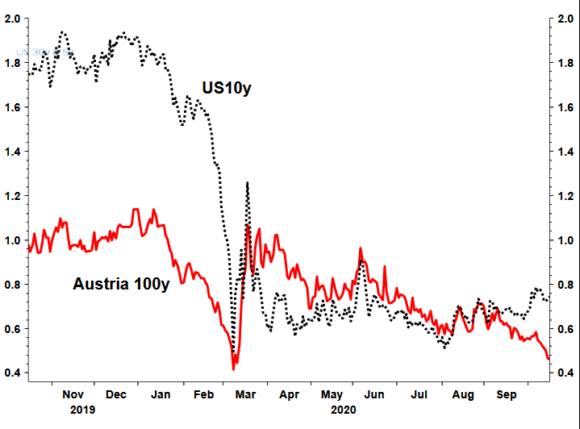 Le due linee che vedete incontrarsi e abbandonarsi rappresentano il trend di rendimento del Treasury statunitense a 10 anni e del bond austriaco a 100 anni. Bene, guardate chi paga un premio di rischio minore a chi vuole detenere il suo debito. Cosa dite, l’Austria è il paradiso terrestre, il regno della sicurezza e della beatitudine o forse siamo di fronte a un combinato congiunto molto sbilanciamento sul lato che vede il debito americano equivalere ormai a carta igienica, manipolato com’è da anni e anni di magheggi della Fed? E signori, la differenza non è da poco, calcolando i due Paesi emittenti, il loro peso economico, industriale, politico e militare e soprattutto la duration della carta in questione: 10 anni per gli Usa, di fatto il benchmark mondiale contro 100 anni (un secolo), praticamente una sorta di polizza assicurativa di cui si sa che non si riscuoterà mai il premio, qualsiasi massimale sia stato stipulato ufficialmente. Serve solo a piazzare i soldi in un posto stra-sicuro, ottenendo in cambio un rassicurante minimo sindacale e la certezza che certe follie non prenderanno mai piede.