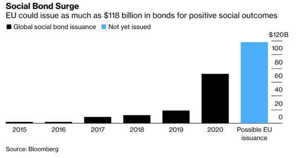 Guardate quest’ultimo grafico, pubblicato da Bloomberg a corredo dell’articolo in cui si dava conto proprio dell’emissione record dell’Ue: signori, siamo solo all’inizio di una nuova, grande bolla! In fatto di indebitamento sistemico sotto mentite spoglie, la next big thing – come la definirebbero gli anglosassoni – dopo la sbandata verde mandata in archivio anzitempo dall’ala raziocinante del board della Bce è quella dei social bonds, ovvero la medesima carta da parati di sempre con rendimenti artificialmente compressi e sottostanti spesso da mani nei capelli che, applicato sapientemente un po’ di maquillage da politically correct e mischiati i vari rating come in una volgare CLO da alchimia finanziaria, diviene l’investimento del secolo.
