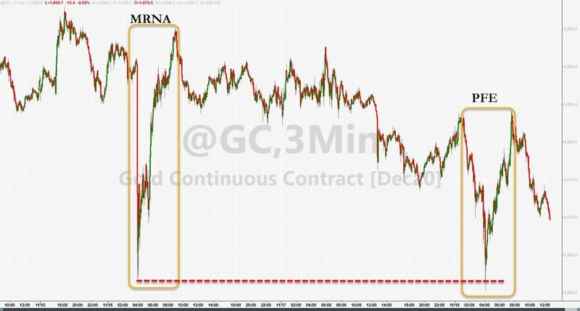 Guardate quest’altro grafico, il quale ci mostra plasticamente quale altro ruolo abbiano giocato gli annunci a ripetizione di Pfizer e Moderna degli ultimi quindici giorni: sopprimere artificialmente gli acquisti sui minimi sull’oro, evitando che il bene rifugio per antonomasia riprendesse il suo rally e ricominciasse così a spoilerare una crisi strutturale in arrivo e insinuando il dubbio nella gente comune di una possibile covid-flation, inflazione da pandemia, già in atto.