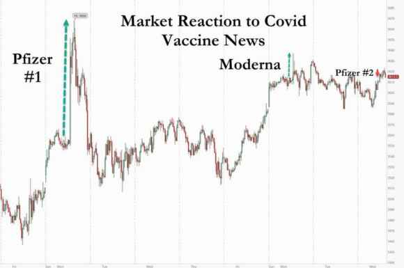 Per questo vi parlo da mesi e mesi di grande reset, termine che ora viene sfruttato in chiave dietrologica per giustificare tesi complottiste sulla nascita e la diffusione della pandemia a fini distopici: quel termine è totalmente e assolutamente economico, finanziario e anche scientifico, nell’accezione statistica del termine. Semplicemente, serve azzerare un china debitoria che non è più sostenibile. Come quando si ristruttura una linea di credito aziendale o un debito pubblico non più onorabile per i costi del servizio: il problema è che qui parliamo del mondo intero, a livello governativo e corporate. Un corpaccione enorme che ha mangiato a dismisura, riuscendo a digerire e non morire di indigestione solo grazie al “sondino” della finanziarizzazione. Ora, come ci mostra il primo grafico relativo alla reazione del mercato ai vaccini, anche il mercato è arrivato al limite. Brucia l’effetto boost di annunci definiti dai media come epocali nell’arco di mezza giornata, prezzandoli di fatto in tempo reale.