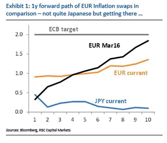 E confermare che quella del governatore dell’Eurotower sia stata solo questione di diplomazia e non di sostanza, ci pensano questi due grafici: le previsioni relative ai prezzi parlano chiaro. E non solo non offrono alcun appiglio di miglioramento nel breve-medio termine, ma, addirittura, delineano sempre più una traiettoria giapponese, una trappola deflattiva in piena regola per l’eurozona.