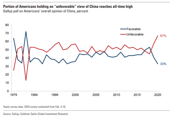 Con 33,6 milioni di disoccupati in 8 settimane e il Pil del secondo trimestre che, stando alle rilevazioni del GDPNow della Fed di Atlanta, punterebbe addirittura al -40%, quale ragione spingerebbe l’America a dar vita al secondo round della guerra con Pechino? Un male maggiore da eliminare. Lo mostra chiaramente questo grafico, dal quale si evince come la strategia di Donald Trump di individuazione e segnalazione del nemico, la vecchia name and shame, abbia finora funzionato alla grande: in una nazione divisa su tutto e mai come oggi ideologicamente polarizzata, i due terzi dei rispondenti si dice d’accordo su un’unica cosa. Ovvero, la visione negativa che si ha della Cina.