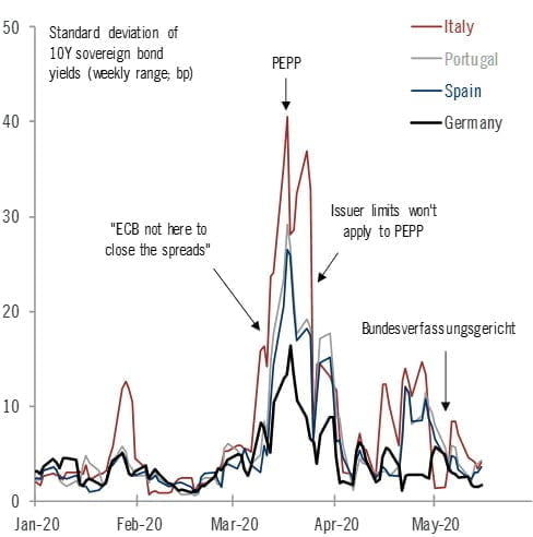 E pensate che questo tipo di strategia sia in atto solo negli Usa? Guardate questo grafico, il quale mette in prospettiva la magnitudo di potere normalizzante messo in campo dalla Bce attraverso il Pepp nei confronti del nemico numero uno, la volatilità. Una componente connaturata nelle dinamiche di debito della cosiddetta Europa periferica, ma che, dopo il picco innescato (a freddo) dalla sciagurata frase di Christine Lagarde sugli spread da calmierare che non rappresentano un compito statutario dell’Eurotower, è rimasta sotto controllo, anche dopo la sentenza della Corte costituzionale di Karlsruhe.