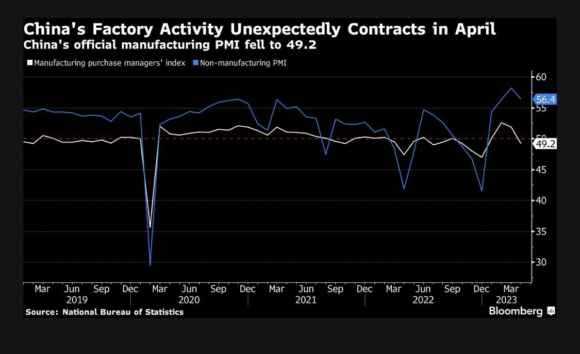 Ecco poi che questo terzo e ultimo grafico mostra la seconda, colossale criticità in progress: la componente manifatturiera del PMI cinese relativo al mese di aprile è scivolata in territorio di contrazione. Contro ogni attesa e previsione. Quindi, oggi Banche centrali e Governi dovranno rivedere i propri piani in virtù di uno sviluppo meno lineare e automatico di una ripresa economica globale trainata da Pechino.