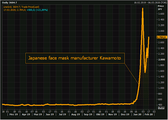 E attenzione, perché il video del papà siriano in modalità La vita è bella che fa credere alla figlioletta come i bombardamenti siano in realtà solo un gioco, divenuto virale e in grado di commuovere il mondo, rappresenta un proxy classico di come certe dinamiche hollywoodiane di disinformazone stiano per tornare in auge. È tutto un enorme baraccone della paura, un emergenzificio, se mi passate questo orrendo neologismo. Guardate questo altro grafico, ci mostra l’andamento al Nikkei del titolo della Kawamoto, principale produttore di mascherine produttive del Giappone.