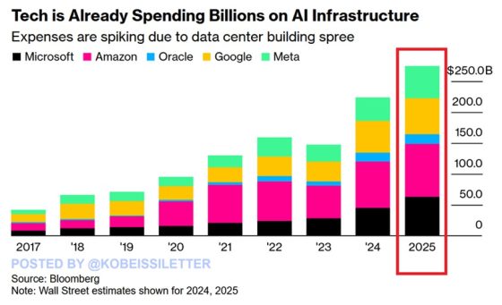E ora? Ora diamo un’occhiata a questo grafico. Cosa ci dice? Che il CapEX o spesa per investimenti fissi di Amazon, Google, Meta, Microsoft e Oracle sul comparto AI quest’anno è atteso al livello record di 274 miliardi di dollari. Il doppio del 2021 e 127 miliardi più del 2023. Solo Amazon e Microsoft investiranno rispettivamente 86 e 63 miliardi.