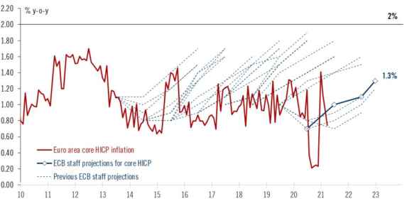 Il nodo dei licenziamenti è dirimente. Per tutti. In primis, per i lavoratori. I quali, ovviamente, poco si interessano alle dinamiche di acquisto della Bce. Ma conoscono molto bene quelle relative all’affitto o al mutuo, alle bollette, ai costi fissi, alla spesa per mangiare e vestirsi. Uno scalone troppo ripido nel ritorno alla normalità delle dinamiche relative al mondo del lavoro, infatti, andrà a impattare pesantemente sul loro potere d’acquisto, in un momento di chiaro trend inflazionistico al rialzo. Il mix più velenoso possibile. E lo stesso membro italiano del board Bce, la colomba ante litteram Fabio Panetta, ieri ha dovuto ammettere che l’area del 2% rischia di essere raggiunta e di prospettarsi come normalità per un certo periodo. La conseguenza? Politica prima che pratica: dopo anni di proiezioni strumentalmente sbagliate al ribasso, al fine di giustificare sempre più Qe per stimolare inflazione, ora si rischia una perdita di credibilità reale da parte della Bce, come mostrano le linee di questo grafico.