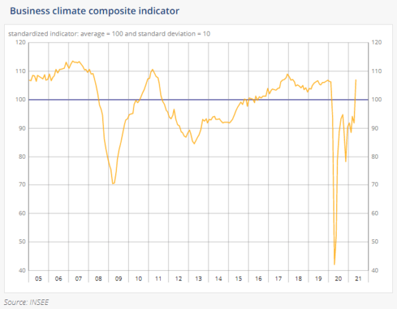 Non può essere un caso: è in atto un’accelerazione sul target mensile che, res ipsa loquitur, mostra già un cambio di impostazione della politica monetaria. E che fa riferimento a dati macro precisi. Il sentiment dell’attività economica francese è ai massimi da 12 mesi, di fatto avendo annullato proprio il gap pandemico, come mostra il grafico. E il tutto, in un contesto di lockdown reale che dura ormai da Natale nel Paese transalpino: cosa pensate che garantisca quell’ottimismo, forse la bella stagione in arrivo? È tutta prezzatura di supporto, niente di più.