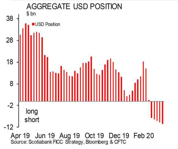 Guardate questo grafico, poi: ci mostra come per la quinta settimana di fila, le posizioni ribassiste sul dollaro abbiano continuato a crescere fra gli investitori speculativi. Solo nella settimana appena conclusa, contratti aperti per altri 833 milioni, i quali hanno portato il totale a 10,6 miliardi di dollari, stando a calcoli di Scotiabank. E qual è a vostro modo di vedere il driver di quelle scommesse al ribasso sul biglietto verde? Ovviamente, il fatto che la Fed operi in modalità tipografia Lo Turco, tramutando il dollaro in carta igienica. Nemmeno a dirlo, tutti di conseguenza scommettono su un apprezzamento dell’euro.