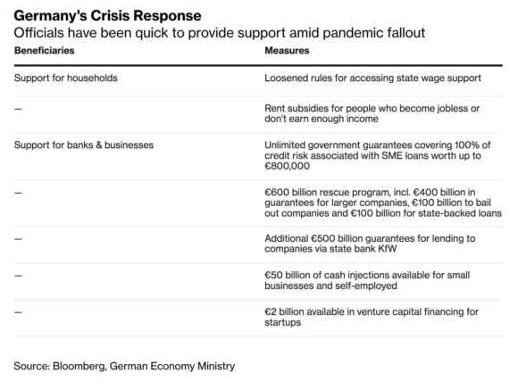 A proposito di Germania, guardate questo schema, pubblicato dalla non tedesca Bloomberg: ecco cosa uno Stato efficiente e non indebitato fino al collo ha messo a disposizione di cittadini e imprese dal primo giorno del lockdown, con pochi e rapidi passaggi via Internet e senza tante trafile. Soldi già sui conti correnti, fabbriche che – di fatto – non hanno mai smesso di lavorare del tutto.