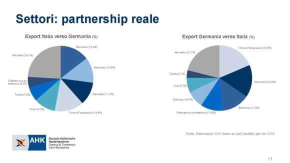 Secondo, la realtà. E qui, scuserete la volgarità del mio ragionamento, faccio entrare in campo cifre, numeri e grafici. Per come sono fatto, infatti, parlare di economie e finanza senza citare mai nemmeno una singola percentuale, mi fa sempre drizzare le antenne, quasi una bandiera rossa a segnalare un pericolo di supercazzola all’orizzonte. Il 9 aprile scorso, in collegamento Skype in ossequio alla quarantena di coronavirus, la Camera di Commercio Italo-Germanica (AHK Italien) ha presentato i dati relativi alla partnership economica bilaterale nel 2019 e i risultati dell’indagine globale “AHK World Business Outlook” sulle prospettive delle imprese italo-tedesche nel nostro Paese, con un occhio di riguardo proprio al fall-out della crisi da Covid-19. Vediamoli, questi dati, per sommi capi.