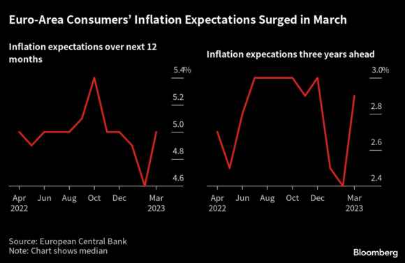 Di cosa si tratta? L’asset swap spread è nulla più che un differenziale di tasso tra il fisso detenuto su un’obbligazione e il variabile che si vorrebbe ottenere dalla banca. In questo caso, il trend viene comparato con i cambiamenti negli standard di prestito bancario degli ultimi tre mesi nell’eurozona. Tradotto? 3-2-1, lo stress creditizio sta per fare toc toc alla nostra porta. E c’è vivamente da sperare che abbia la decenza e la pazienza di bussare. Perché a fronte dell’ultimo trend emerso in casa Bce, è difficile escludere un fragoroso ingresso senza preavviso. E con porta abbattuta in stile SWAP. Quest’ultimo grafico ci mostra le previsioni per l’inflazione europea nel mese di marzo. Se il 5% atteso per i prossimi 12 mesi ci dice qualcosa rispetto alla famosa transitorietà, il 2,9% che viene previsto nell’arco temporale a 3 anni potrebbe portare con sé un paio di riflessioni.