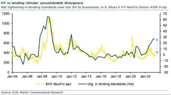 Non è tranquilla. Per nulla. E il fatto che a suonare l’allarme in tal senso sia Commerzbank non appare una casualità. Questo grafico è apparentemente complesso, quantomeno perché scomoda acronimi come ASW per quanto riguardo lo spread in punti base dell’alto rendimento non finanziario.