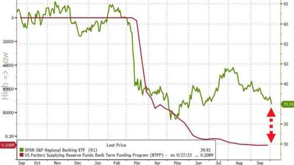 Ed ecco che il grafico pubblicato nei commenti ci offre un indizio su quale potrebbe essere il catalizzatore di una potenziale big rotation. Stante un sostegno divenuto permanente e notevolmente oltre le aspettative – con i suoi circa 100 miliardi di utilizzo settimanale della facility Fed -, ecco che l’Etf che traccia l’andamento delle banche regionali Usa ora ha ricominciato a flettere, come mostra il grafico.