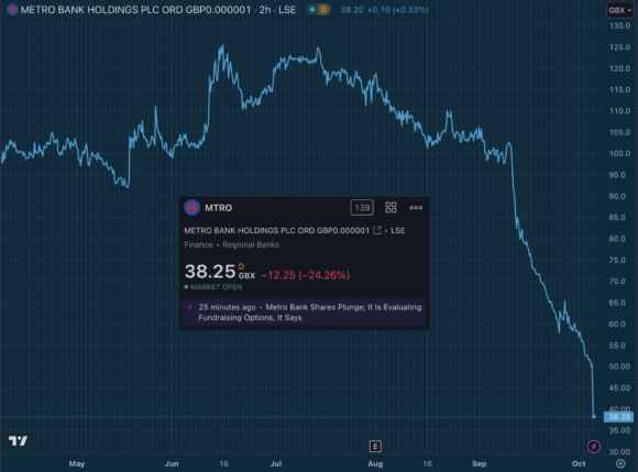 Fast forward a oggi. Quello nel grafico è l’andamento del titolo di Metro Bank giovedì alla Borsa di Londra. A fine giornata. -29%. Ma dopo due sospensioni da circuit breaker che andavano oltre il -35%. Nell’ultimo mese, -66%.