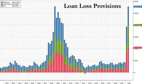 Nel grafico sono riportati, attraverso diversi colori, i controvalori dei cuscinetti posti in essere da tre istituti – JP Morgan, Wells Fargo e Citigroup – per ammortizzare l’ondata di insolvenze su crediti che viene preventivata per l’autunno, quando lo tsunami di default corporate sarà divenuto realtà e la disoccupazione mostrerà il suo vero volto al Paese. Solo per quelle tre banche, relativamente al secondo trimestre, parliamo di qualcosa come 28 miliardi di dollari, 10 in più dei primi tre mesi dell’anno. Una sola volta nella serie storica si registrò un livello marginalmente superiore a quello attuale: il quarto trimestre del 2008. Di più, le previsioni di perdita combinate delle tre banche nel secondo trimestre portano il totale per l’anno in corso a 47 miliardi di dollari, una cifra che è superiore a quanto accantonato dai tre istituti messi insieme negli ultimi tre anni.