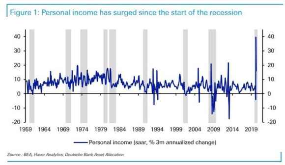 E sapete chi pagherà il prezzo più alto? Ce lo mostra quest’ultimo grafico, il quale ci spiega come paradossalmente quelle previsioni di perdite record delle banche commerciali Usa rappresentino uno dei pochi punti di adesione alla realtà dell’intero quadro. Il dato del personal income (reddito personale) negli Stati Uniti, infatti, è ai massimi storici.