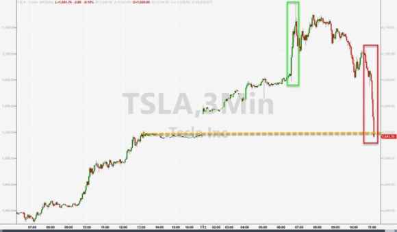 Cos’ha rovinato la festa al titolo di Tesla il 13 luglio scorso, dopo un rally di oltre il 60% in due settimane e 300 dollari di aumento della valutazione per azione in poche ore di contrattazioni? Cos’ha fatto in modo che, nell’arco di quattro ore, il titolo bruciasse un +16% e chiudesse in calo del 3%, come mostra il primo grafico più in basso? Eppure, anche quel giorno il vento era in poppa per la punta di diamante del Nasdaq dei miracoli. Elon Musk aveva confermato il Battery Day per il prossimo 15 settembre e gli analisti prezzavano come bullish la possibile inclusione del titolo nello Standard&Poor’s 500 e l’ingresso in grande stile del marchio nel mercato indiano.