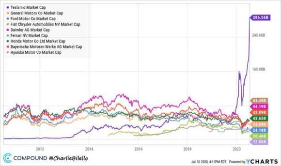 Fermiamoci un attimo. E riflettiamo su quest’altro grafico, il quale mette in prospettiva il livello di bolla speculativa cui è giunto proprio il titolo Tesla. Qualche numero, tanto per non parlare al vento.
