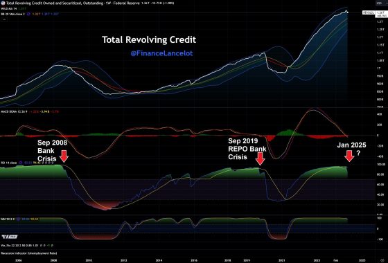Israele invade il Libano e l’Iran attacca per ritorsione? Basta dare un’occhiata a tre numeri cristallizzati nella chiusura di contrattazioni di mercoledì. Wti a 78,56 dollari (+2,87%), rame 4,3960 (+1,23%) e legname da costruzione 566,00 (+2,82%). Si comincia, insomma. Tremori sui prezzi. Tanti detonatori. Pronti a far esplodere il mega-panetto di esplosivo al plastico che ci viene mostrato nel grafico: il credito revolving totale sta collassando. E cosa sia accaduto le ultime due volte che si è sostanziata questa dinamica appare evidente.