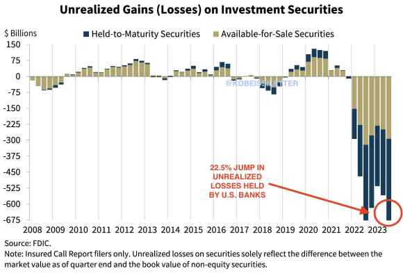 Ad esempio, nell’arco delle 24 ore fra il 28 e il 29 novembre, il debito Usa è salito di altri 61 miliardi, raggiungendo il nuovo record di 33,827 trilioni. Insomma, mancano solo 173 miliardi ai 34 trilioni. E, tanto per amore di prospettiva, quota 33 trilioni fu toccata solo due mesi fa. Ma come se questo non bastasse, ecco che questo grafico ci mostra come – contemporaneamente – le unrealized losses della banche Usa abbiano toccato il nuovo record di 684 miliardi nel terzo trimestre, un sobrio +22,5% su base annua.