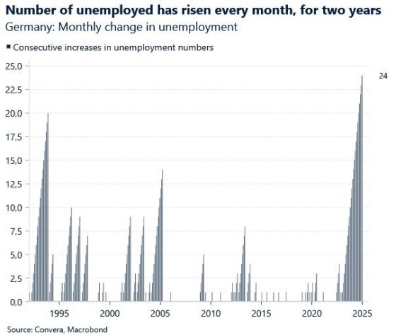 E attenzione al vero contesto in cui avverranno queste elezioni spartiacque. Nel quarto trimestre del 2024, in Germania sono state 4.215 le insolvenze corporate. Un +16,8% e il numero più alto dalla crisi finanziaria globale del 2008. Ma, soprattutto, attenzione al grafico: negli ultimi due anni, il numero di disoccupati in Germania è cresciuto al ritmo massimo dalla Riunificazione. E in maniera costante su base mensile. Il tutto mentre l’Ue parlava di soft landing e assenza di rischi recessivi e il Dax sfondava un record al giorno. Cosa accadrebbe, quindi, se arrivasse una recessione?