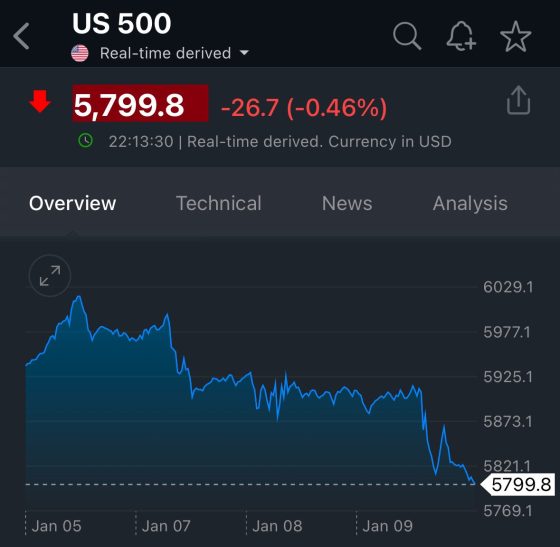 Attenzione ai facili entusiasmi. Il rally post-elettorale è ufficialmente finito. Molto più di quanto ci mostra questo grafico, il quale ricorda come i futures sullo S&P 500 all’alba di ieri, quando iniziavano le negoziazioni e l’Asia suonava la sua campanella, sono scesi sotto quota psicologica di 5.800 punti per la prima volta dal 5 novembre scorso.