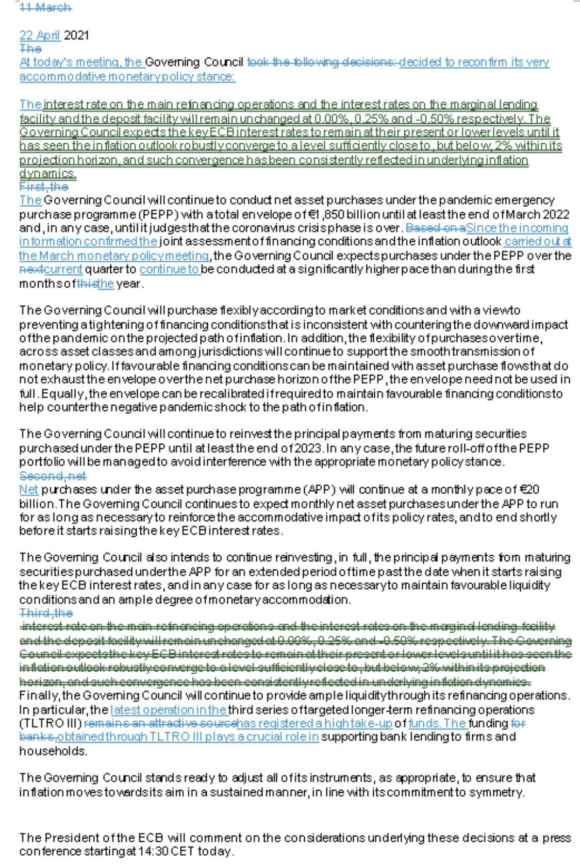 Al riguardo, vi pare un caso che l’enfasi maggiore – si fa per dire – nel comunicato Bce sia stata posta sull’importanza delle aste di rifinanziamento bancario a lungo termine, Tltro? Questa immagine mostra le parti cancellate/aggiunte nel comunicato di ieri rispetto a quello dell’11 marzo scorso: siamo alla presa in giro del CtrlV-CtrlC, a vostro modo di vedere oppure no?