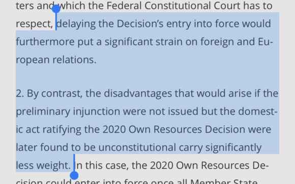 La stessa Corte di Karlsruhe, nel bocciare il ricorso contro il Recovery Plan che aveva bloccato il processo di esborso dei fondi, ha utilizzato una formula che in sé racchiude tutta la drammaticità del momento: la leggete in questa grafica e tradotta dal burocratese al linguaggio terra-terra ci dice che nonostante i presupposti di liceità di quel ricorso ci siano potenzialmente tutti, i danni politico-economici del suo recepimento per l’intera Unione sarebbero nell’immediato superiori a quelli reputazionali per la Corte quando, in un futuro prossimo, sarà magari costretta ad ammettere il suo errore di valutazione.