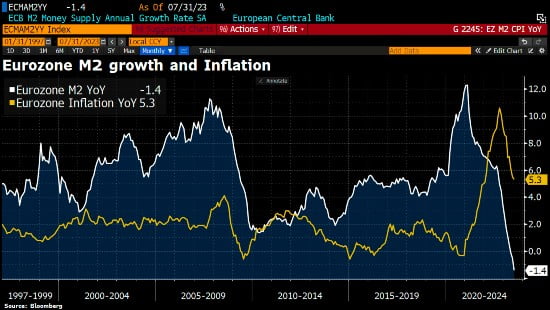 suona come una condanna in attesa di esecuzione. Ma già emessa contro il nostro Paese, il suo sistema bancario e soprattutto quello produttivo. A luglio la massa monetaria M2 si è contratta dell’1,4% su base annua nell’eurozona, il massimo nella serie storica. E l’immagine sembra offrire una spiegazione all’atteggiamento da falco di Christine Lagarde a Jackson Hole. Non solo voglia di non lasciare solo Jerome Powell nel ruolo di cattivo, ma convinzione che un’ulteriore stretta ai rubinetti garantirà il re-couple al ribasso del tasso di inflazione. Ancora ben lontano dal 2%.
